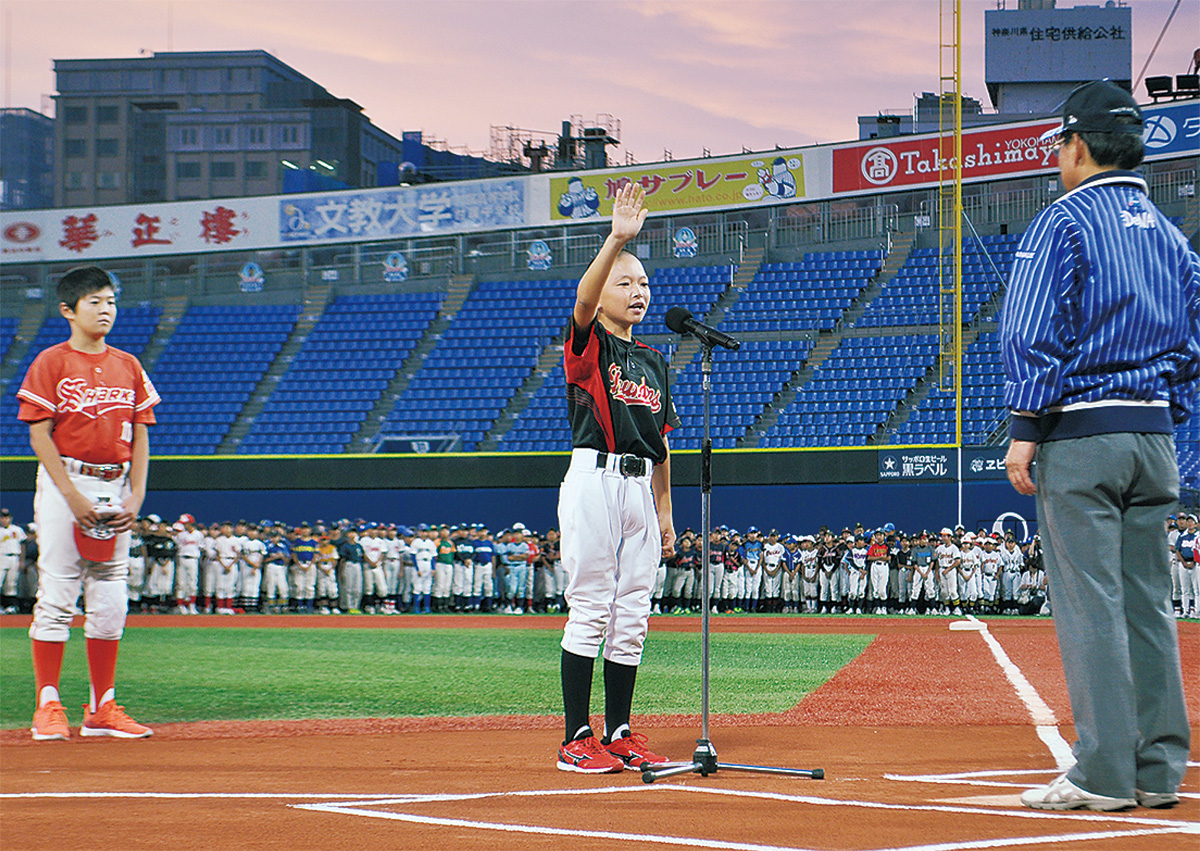 参加チームが一堂に集まった開会式では、サンダース(相模原市/野球)の冨岡陽生君と、綱島東シャークス(港北区/ソフト)の大島適太君が選手代表として、健闘を力強く誓った。大会会長の花上喜代志さんは、横浜スタジアムが東京オリンピックの野球とソフトの会場になっていることに触れて、「五輪に向けて盛り上げてもらえれば。そして、思い出に残る大会にして欲しい」と呼びかけた。