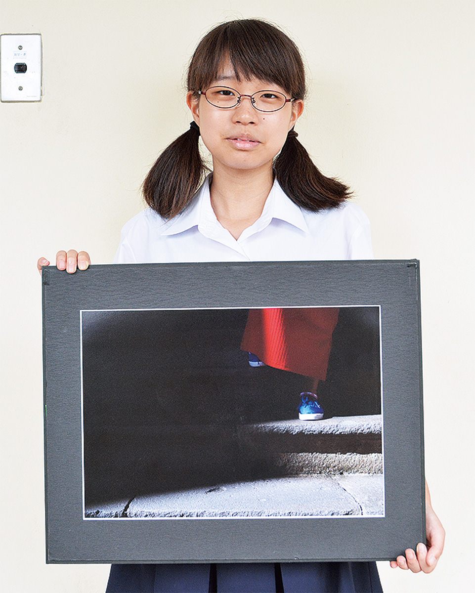修学旅行で札幌を訪れた際、赤れんがで有名な北海道庁旧本庁舎の一角で友人をモデルに撮影した。タイトルは「愁苦(しゅうく)に影(かげ)す」。光と影の境目に足を置き、戸惑いながらも未来に向かって歩む心情を「影す=光がさす」という言葉に託した。服の赤と靴の青、影の黒など色彩の対比もポイントだ。