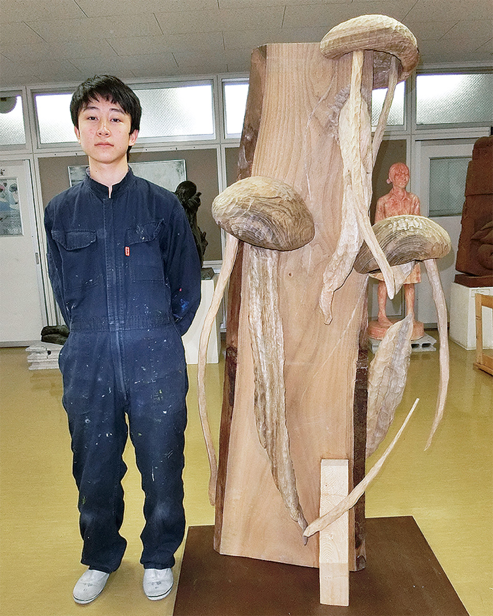 高さ180cmの木彫作品を出品する橋本さん。昨年の県高校美術展にて高文連会長賞を受賞し、初の全国が決まった。隼人高校美術部としては20年連続の出品となる。