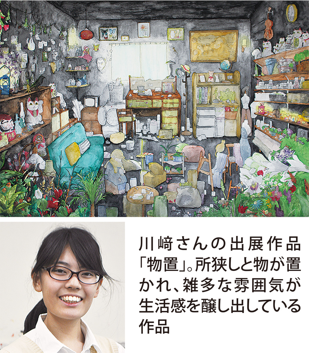 美術部副部長の川崎さんは、水彩画「物置」を出展。半年かけて創作したというB1版(728mm×1030mm)の力作で、昨年の県高校美術展で奨励賞を受賞し、全国出品も決まった。