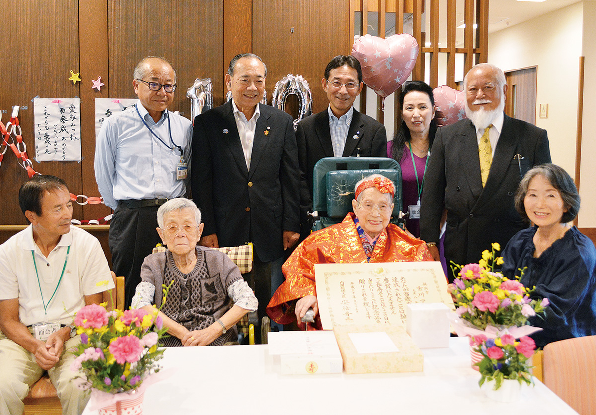 20日に森区長らが訪れたのは、瀬谷町の特別養護老人ホーム「愛成苑」。入居者の愛敬みつさん(102)、市川アヱさん(99)を祝い、来年3月に100歳を迎える市川さんには表彰状と記念品を手渡した。市川さんは同施設に2年ほど前に入所。この日は、沖縄で長寿を祝う際に着る伝統衣装を身に付け、笑顔を見せていた。駆けつけた三女の知念久枝さんによると、「母の元気の秘訣は、おいしいものを食べることと、怒らず笑顔でいること。自分も見習っています」と話していた。