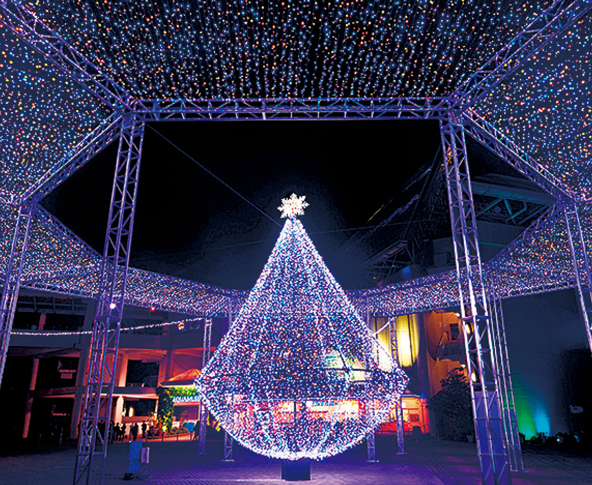 注目は「ブリリアント・ツリー」。空中に浮かぶ八角形の光のツリーは高さ8m。頭上に広がる幅24mの光の帯がツリーを取り囲み、煌びやかな空間を作り出す。そのほか、全長100mの光のトンネルが続く「グリッター・シェルロード」や、水族館の屋根にプロジェクションマッピングが投影される「スカイライトマジック」が見どころだ。