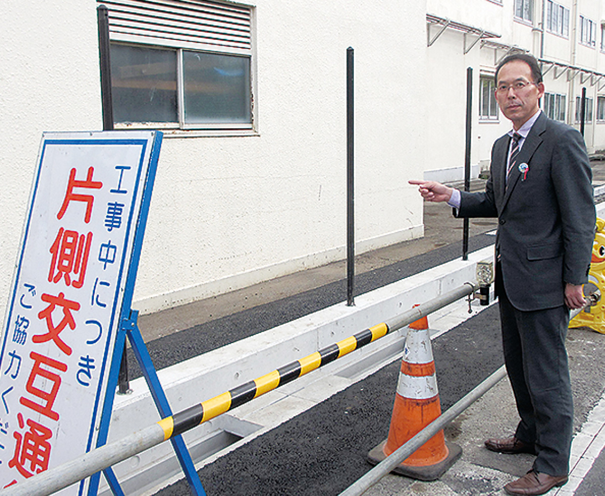 原中学校沿いのかまくら道で、歩行者通行帯工事が進められています。他の狭あい道路は、電柱の地中化をはじめ、道路拡幅、交差点や交通危険箇所の改良、歩道やバス専用停車スペースの設置など改善提案を図ります。