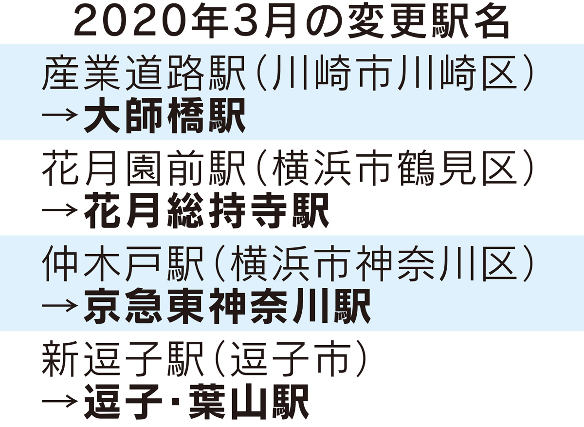 花月園前駅=鶴見区=が「花月総持寺」、仲木戸駅=神奈川区=が「京急東神奈川駅」、産業道路駅=川崎市川崎区=が「大師橋駅」、新逗子駅=逗子市=が「逗子・葉山駅」にそれぞれ変わる。