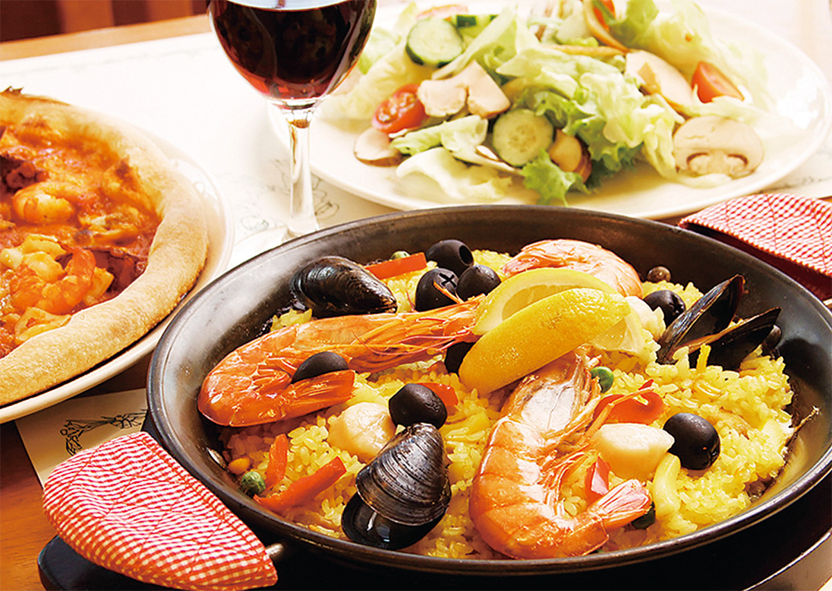 ピザと一緒に大皿に盛った料理を家族や友人同士で取り分けて楽しむのがヒッコリースタイル。好みのメニューを組み合わせて楽しめるのが同店の魅力だ。改元を祝福する特別コース「パエリアコース/お一人様2700円(税別)・2名〜」は、自慢のピザと、サフランホールで炊き上げた黄金色の魚介パエリア、切りたての生ハムなどを堪能できる。素材からでる自然な旨みでいっぱい。