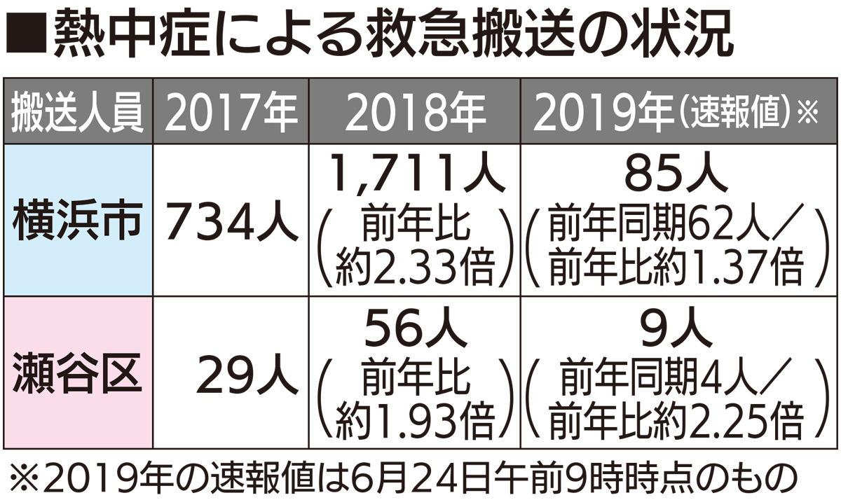 同署によると、今年は4月29日から熱中症の救急搬送の集計を始めた。6月24日午前9時までに9人の搬送があり、年代は10代や20代、80代と幅広い。発生場所は屋外が8人と多かったが、関東で30度を超える真夏日が続いていた5月26日は、エアコンを使わず屋内にいた人が搬送された。また、6月6日には体育祭を開いていた瀬谷中学校で、生徒15人にめまいや嘔吐の症状があり、そのうち5人が搬送された。