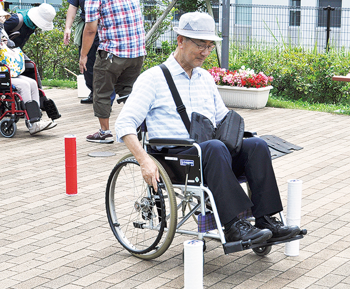 午後の部では、瀬谷区障害者地域自立支援協議会(せやまんまるねっと)の会員が車椅子の種類や操作方法を説明。介助者として手押し型車椅子を移動させる時は特に下り坂に注意が必要だとして、「乗っている人の安全を確保するため、介助者が後ろ向きで坂道を下るケースもある」と説明した。自走式の車いすを体験した畑中幸一さんは「坂道は、上がってから下がると勢いがつき過ぎて怖い。ダンボール2枚分の厚みを乗り越えるのも一苦労でした」と話した。