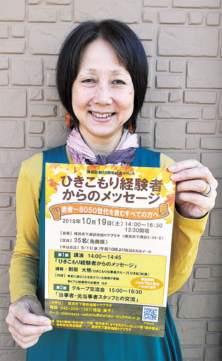 ひきこもり状態にある人などの居場所づくりを進める団体「ゆるり瀬谷」(青木貴子代表)が10月19日(土)、「ひきこもり経験者からのメッセージ」と題したイベントを下瀬谷地域ケアプラザで初めて開く。青木さんは「当事者や経験者の声を聞き、交流できる貴重な機会。多くの人に参加して欲しい」と呼びかける。