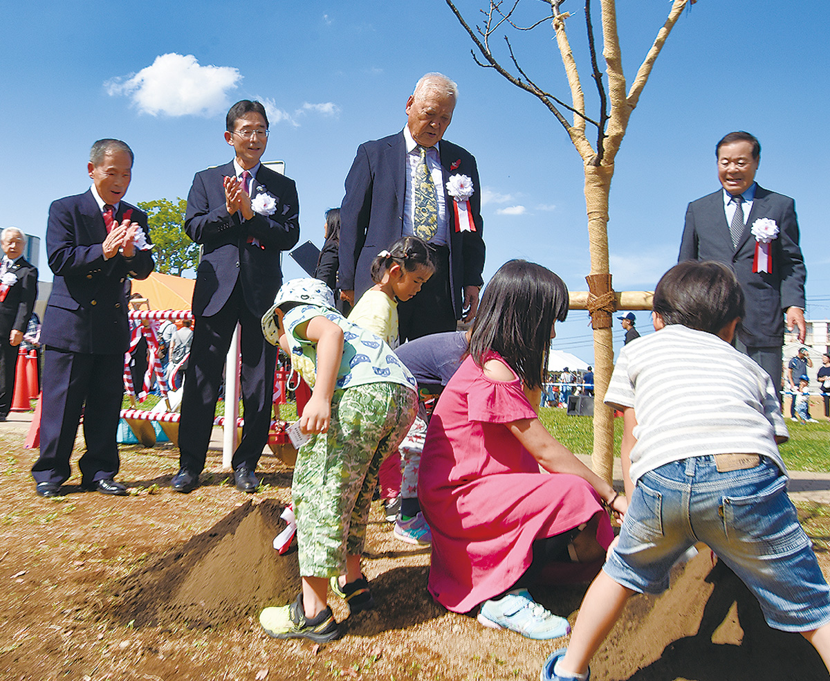 植樹は網代委員長や森区長をはじめ、同委員会会員らのほかにも、公園にいた子どもたちも参加した。子どもたちはスコップで横浜緋桜の根元に土を優しく被せた。