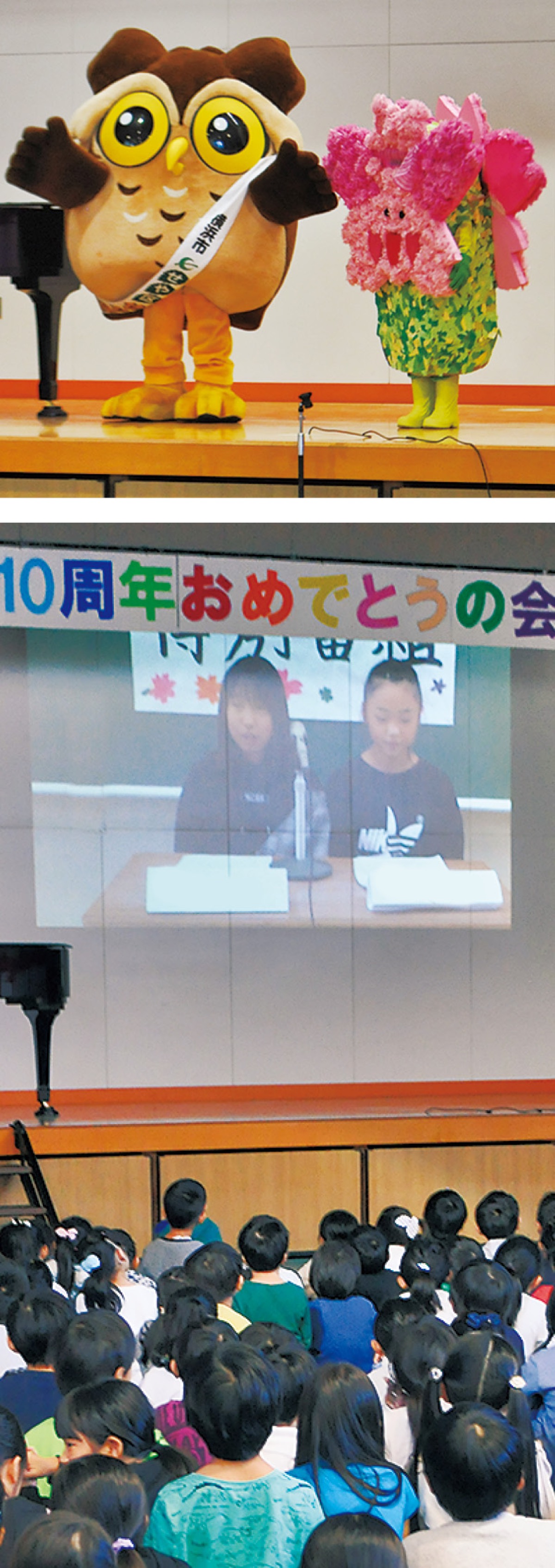 9日には森秀毅区長や市会議員など来賓を招いた記念式典が行われた。網代委員長は「歴代の校長や教師、地域の皆様の努力により今日を迎えられたことに御礼申し上げたい」と挨拶。伴校長は「保護者や地域の方々に支えられての10周年。今後も子ども達に愛情を注いでほしい」と話した。