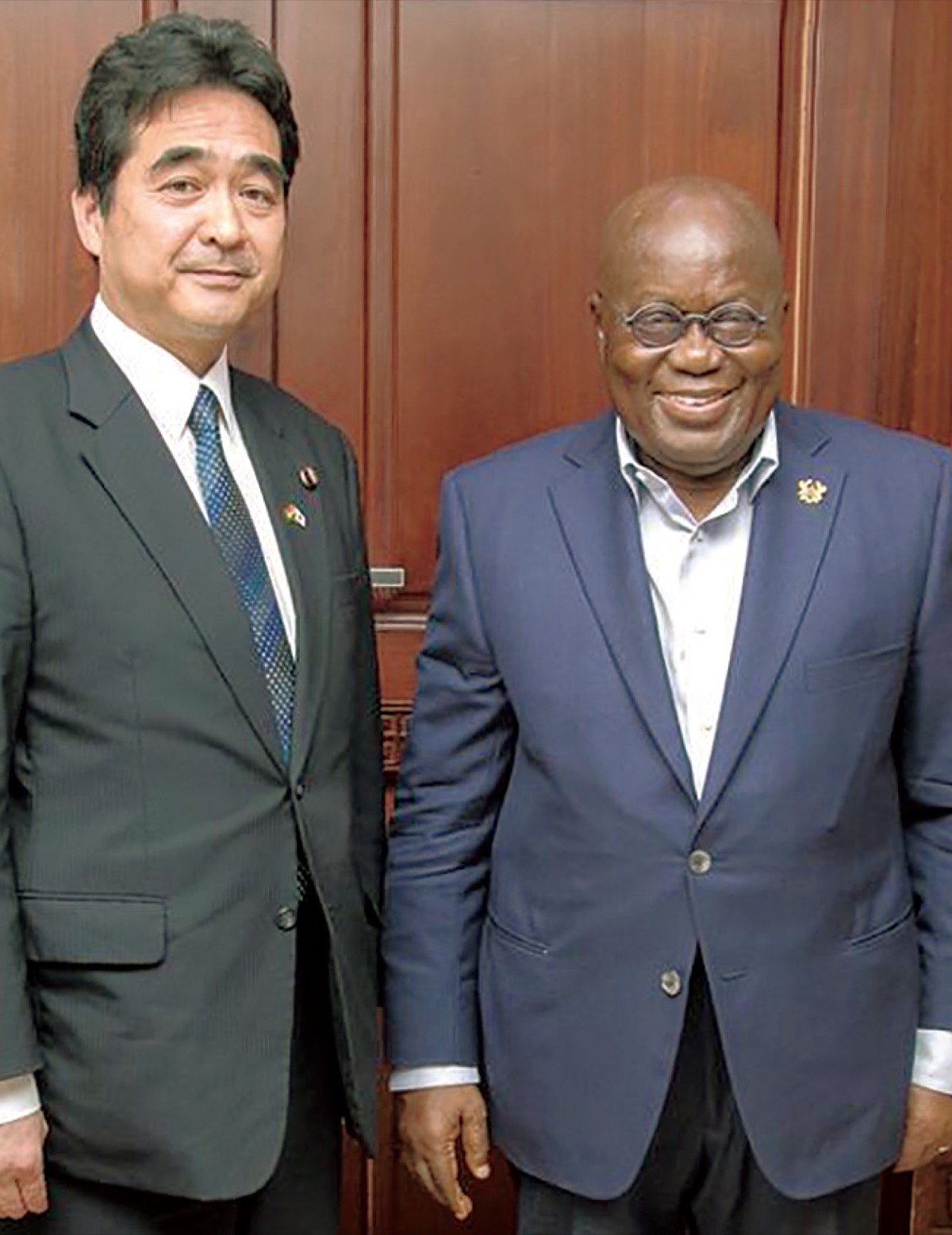 日本・ガーナ友好議員連盟の会長を務める坂井氏。2017年、アクフォ=アド大統領の就任式に出席し、天皇陛下(現・上皇さま)の祝電を手渡すなど、信頼関係を深めている。今回も大統領と会談し、両国間の交流活性化をした。