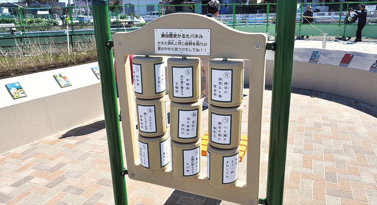 拡張区域は約2ヘクタール。住民のアイデアを取り入れて設けられたのが、1980年に作成され、区内の民話や名所を今に伝える瀬谷歴史かるたの遊具だ。読み札と絵札が設置されており、遊びながら歴史に触れられる仕組み。近くには、かるたに載っている場所を地図で示した案内板も設けられている。