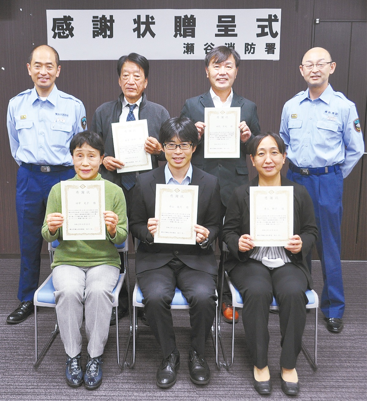 意識不明の重体だった60代男性を協力して救助・救命したとして、区民5人が10月30日、瀬谷消防署(西川浩二署長)から表彰された。表彰されたのは中山俊之さん(38)、井上郷子さん(47)、田中光子(てるこ)さん(71)、田代哲也さん(53)、奥澤幹雄さん(70)。