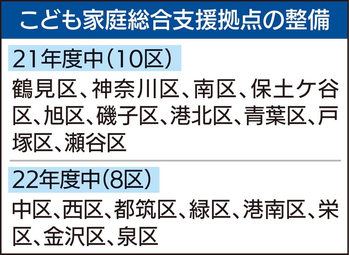 21年度中に鶴見区、神奈川区、南区、保土ケ谷区、旭区、磯子区、港北区、青葉区、戸塚区、瀬谷区の計10区に同拠点機能を設置。児童虐待対応の専任化を図るため、保健師やこども家庭支援員、社会福祉職等を増員する。22年度中に残りの8区にも整備する計画。