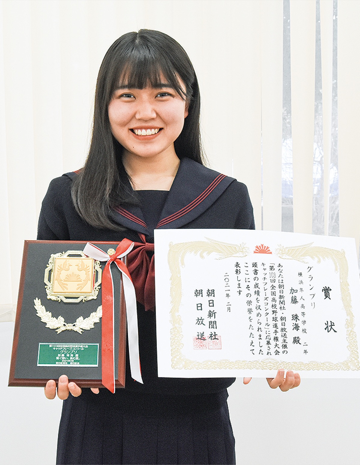 横浜隼人高等学校の加藤珠海(たまみ)さん(2年)がこのほど、第103回全国高校野球選手権大会キャッチフレーズコンクールで、全国1万512点の中から最高賞となるグランプリを受賞した。作品「繋ぐ想い、挑む夏。」は、今夏の同大会公式ポスターやパンフレットなどにも使用される予定だ。
