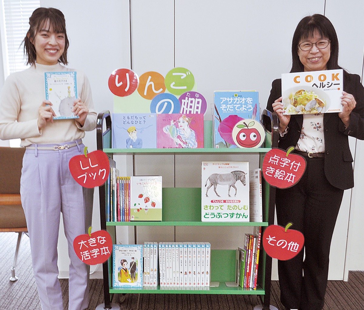 「りんごの棚」は、スウェーデンの公共図書館が発祥。言語障がいのある子どものために作られたりんごのおもちゃが名前の由来で、コーナーや本のマークに使われている。同様のコーナーが図書館に設けられることはあるものの、区役所での導入は珍しいという。同課の職員によると、障がい者支援施設の関係者などが来庁する機会は多く、「用事のついでに本を借りて、それぞれの事業所で楽しんでもらえれば」と期待する。