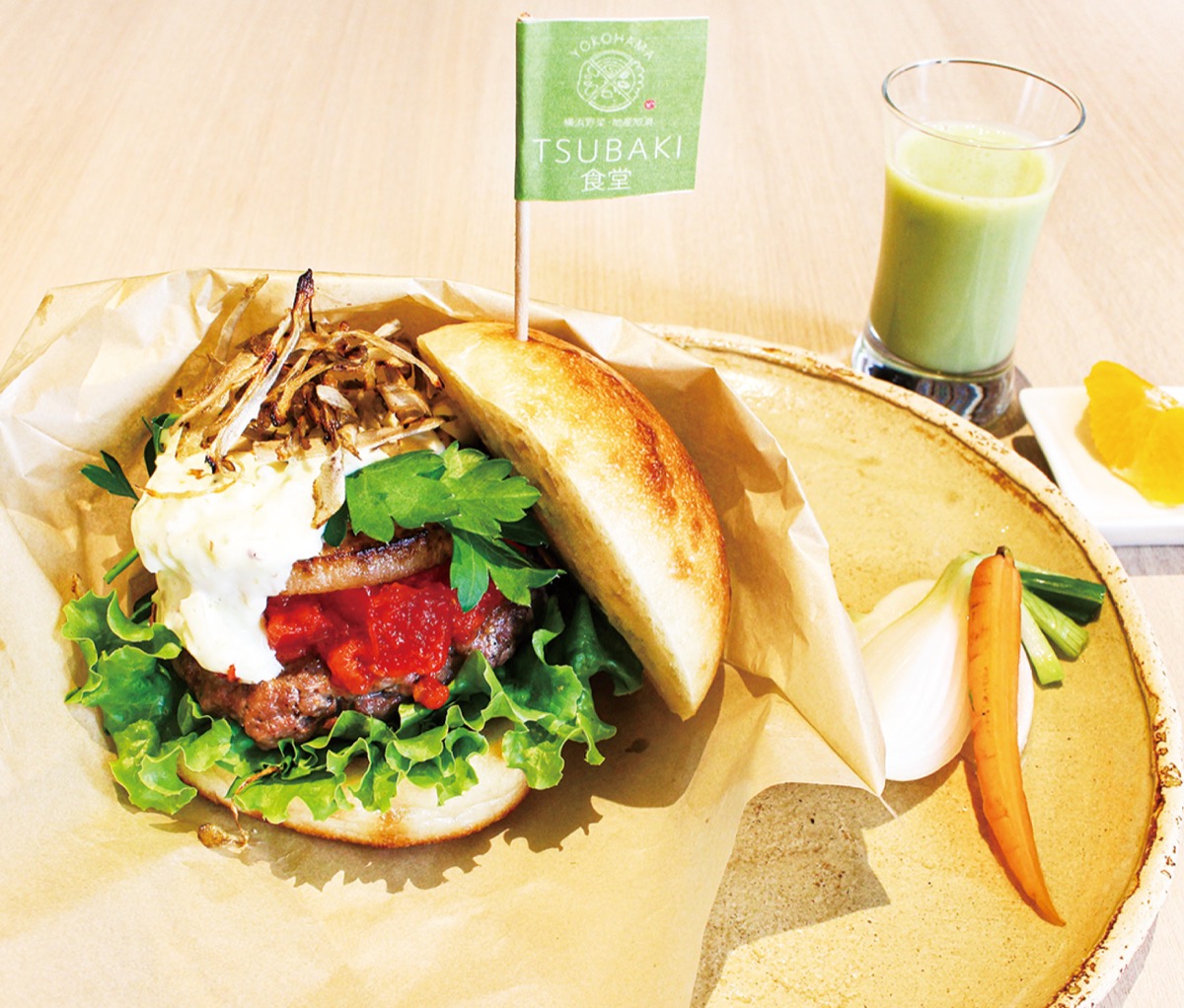 横浜市の”農”の魅力を伝える「横浜18区丼」として、区内で生産された牛肉や野菜を使った「横濱ビーフの瀬谷バーガー」が、横浜市庁舎の商業施設内にある「TSUBAKI食堂」(中区)で提供されている。