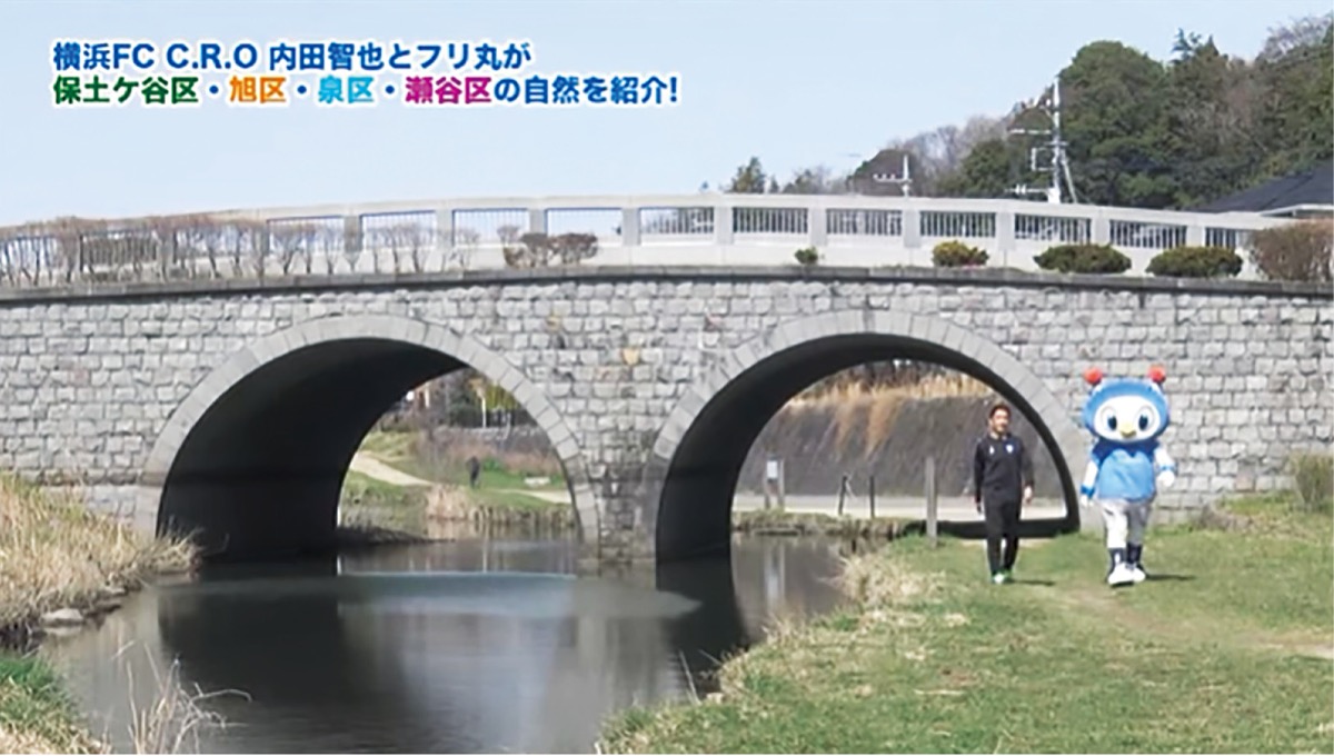 瀬谷区は和泉川のめがね橋を中心に、東山の水辺や川に住む生物、瀬谷本郷公園などを紹介。動画はYouTubeで「横浜FC 4区紹介」と検索するほか、区役所2階のデジタルサイネージでダイジェストバージョンが放映されている。