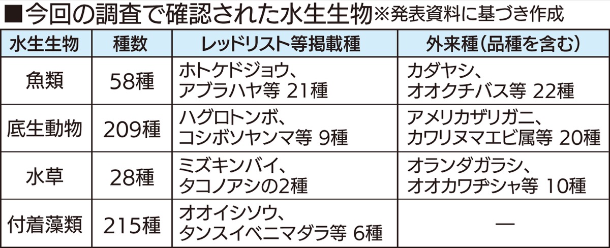 発表によると、今回の調査では魚類・底生動物・水草・付着藻類で合計510種が見つかり、前回(14年〜15年)から71種増えた。絶滅の恐れがあるとして、環境省レッドリストなどに載っているのは38種。そのなかにはアブラハヤやハグロトンボなど個体数が大きく回復した種もあったという。また、生物指標を用いた水質調査では40地点が「きれい」以上の評価だった。