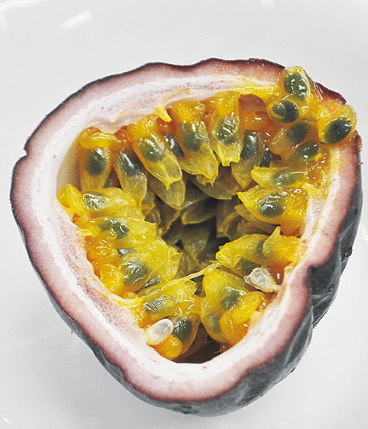 明治時代にハワイから国内に伝わったとされるパッションフルーツ。芳醇な香りや甘酸っぱさが特徴で、半分に切って生のままゼリーのように食べたり、ジュースやソースにしたりと様々に活用されている。