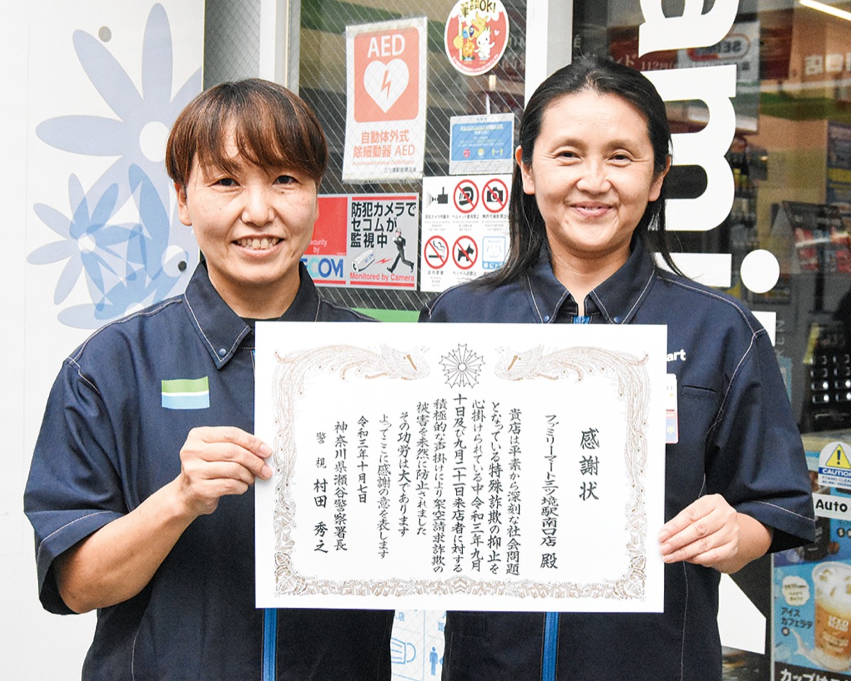 ファミリーマート三ツ境駅南口店は10月7日、電子マネー購入による架空請求詐欺を2件防いだとして瀬谷警察署から感謝状が贈呈された。