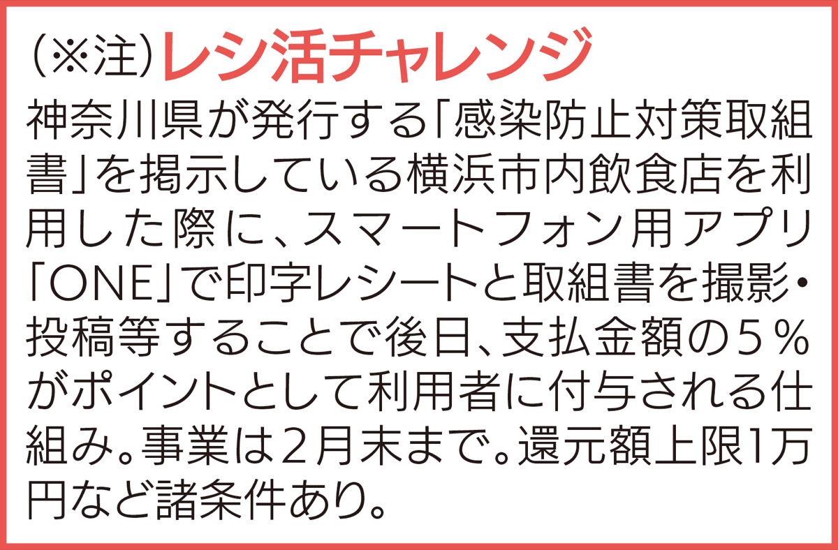 新型コロナウイルスの影響で苦境に立たされている飲食店を支援しようと、横浜市が昨年12月から始めたレシートを活用した市内飲食店利用促進事業「レシ活チャレンジ」(※注)の利用が想定を大幅に下回っている。1月13日時点でのポイント還元金額は上限の5%程度。今後、市は利用促進に向けPRなどを強化する方針だ。