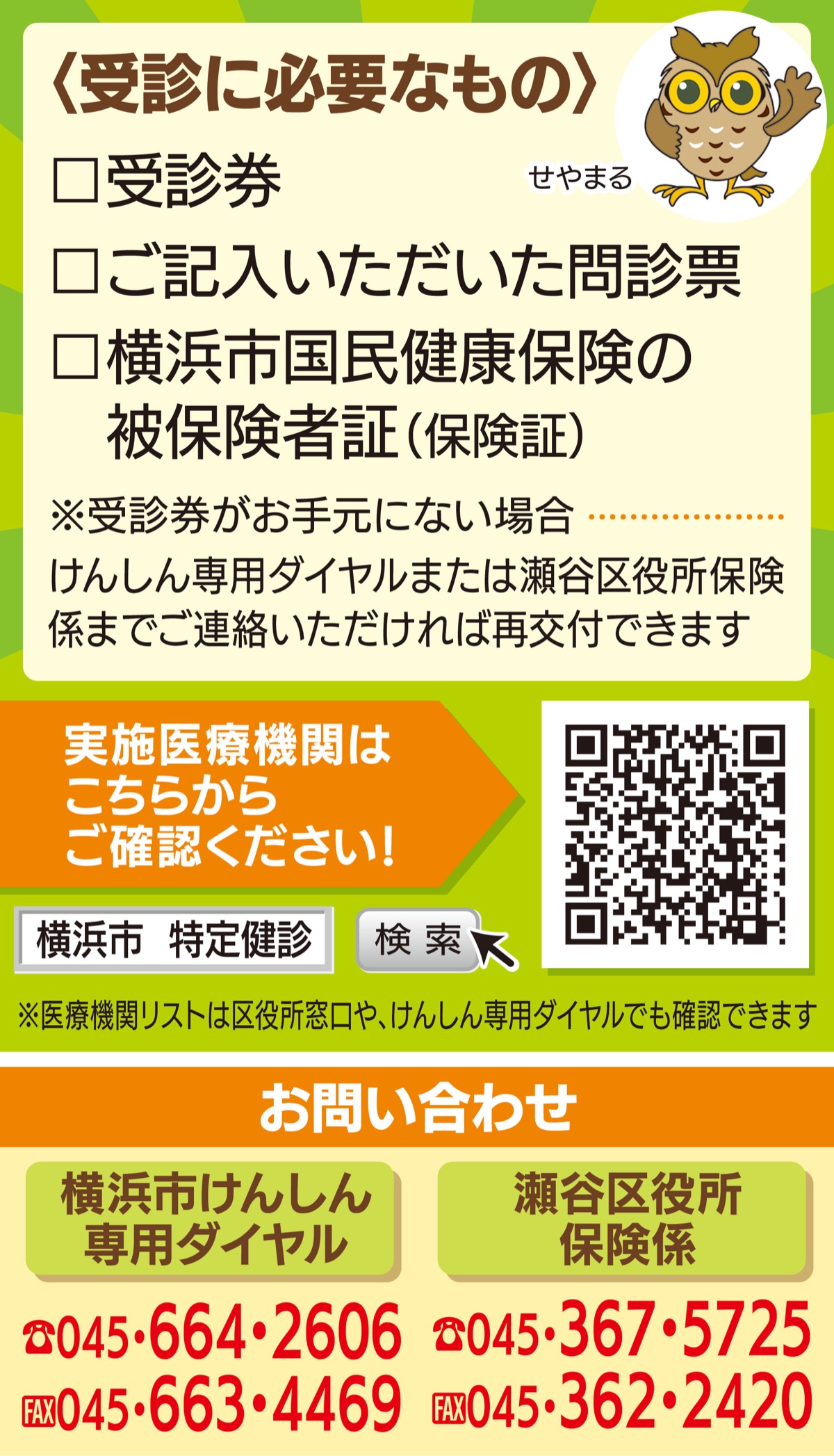FAX:045-362-2420https://www.city.yokohama.lg.jp/kurashi/koseki-zei-hoken/kokuho/kenko/kensin.html