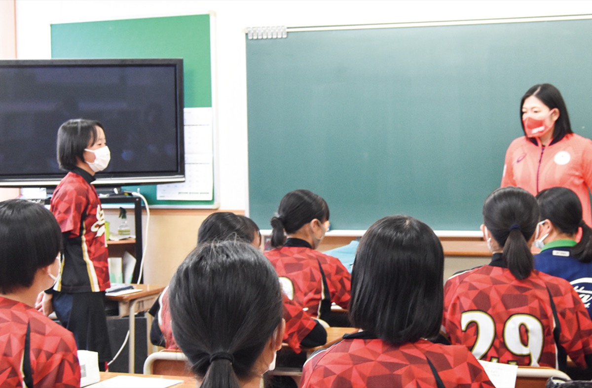 また、生徒から「チームが負けている時の切り抜け方」などの質問を受け、「ピンチの時こそ失敗を恐れず、積極的にプレーを」とアドバイス。キャプテンの四元美結さん(2年)は「緊張はしたけれど、楽しかった。とても気分が引き締まった」と笑顔で話した。