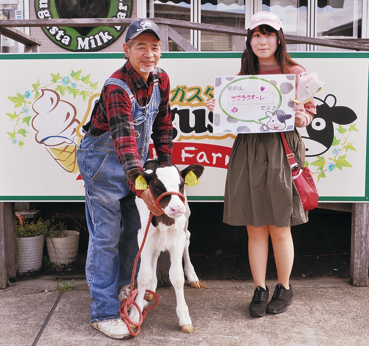 「瀬谷の逸品」インスタグラムキャンペーンの賞品として、市内在住の伊奈乃彩さん(20代)が、オーガスタミルクファーム((有)相澤良牧場/阿久和南)で生まれた牛の命名権を獲得。今月5日に牧場を訪れた伊奈さんは、子牛に「サクラクオーレ」と名付けた。