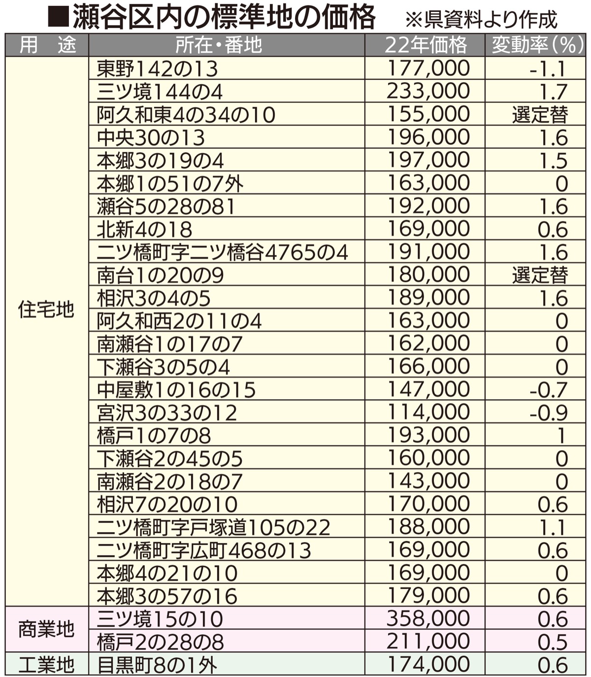 区内住宅地と商業地の平均価格は21年調査でともに下落していた。22年の平均価格はいずれも前年から上昇しており、住宅地はプラス0・5%の17万3500円、商業地はプラス0・6%の28万4500円。工業地はプラス0・6%の17万4000円だった。住宅地の最高価格は三ツ境144の4の23万3000円。