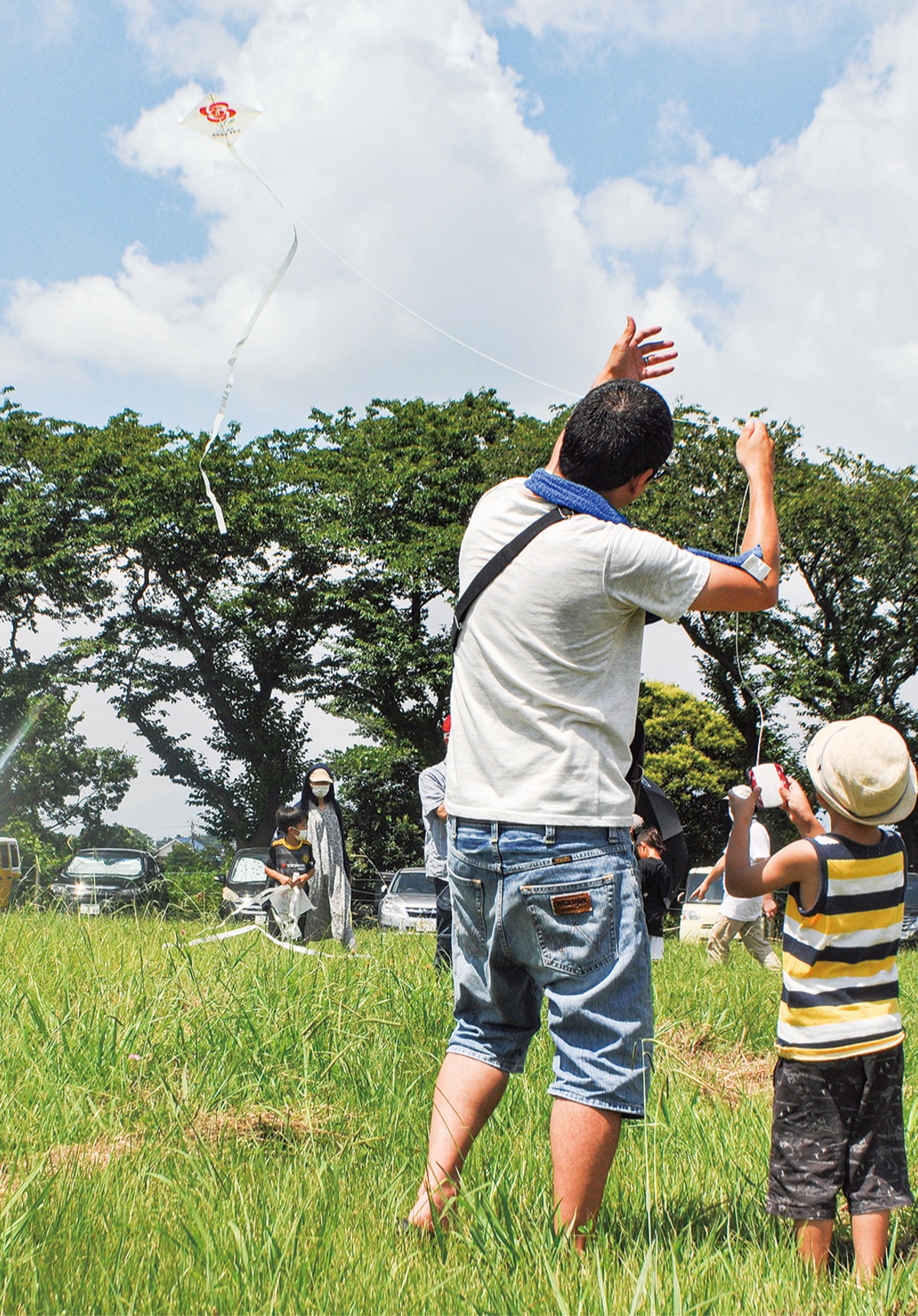 23日は子どもたちなどが、国際園芸博の推進ロゴマークがあしらわれたミニ凧の掲揚に挑戦。はらっぱを走り回りながら凧を空高く飛ばした。同支部の会員は「凧の絵柄を見ながら揚げるようにしましょう」と遊ぶ時のコツを指導していた。