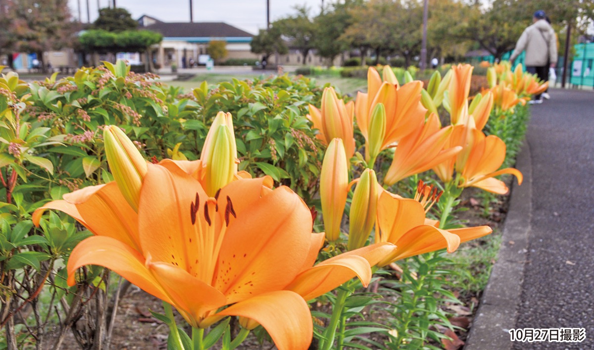 境川沿いの瀬谷本郷公園(本郷1の70の2/駐車場あり)で秋のユリが開花し、来園者の目を楽しませている=写真。