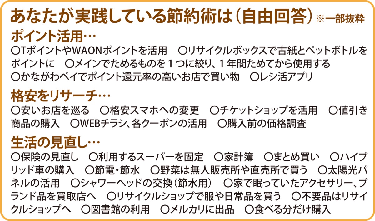 【節約術】に関する自由回答では「ブランド品やアクセサリーの売却」や「保険の見直し」「クーポンの活用」「格安スマホへの乗り換え」「太陽光パネルの設置」など、多様な意見が寄せられました。