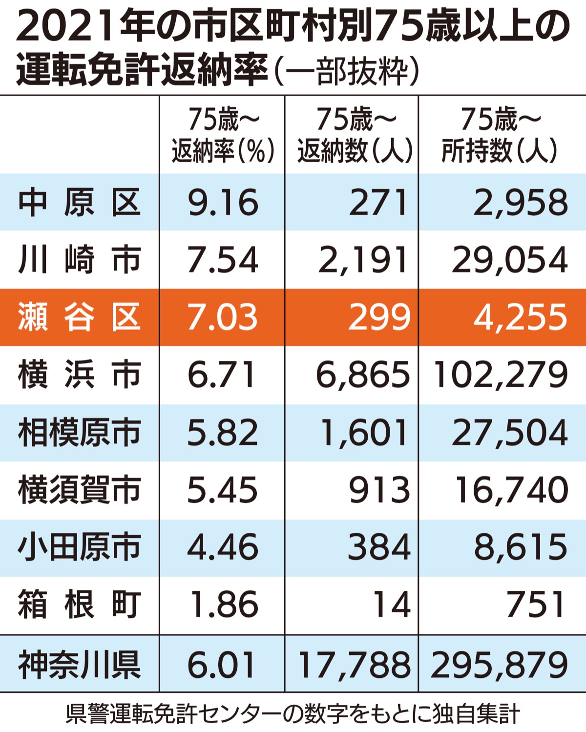 タウンニュース社はこのほど、75歳以上の高齢ドライバーの運転免許自主返納状況について神奈川県内の市区町村を対象に調査を実施した。2021年の自主返納率は、県内市区町村別で見ると地域差は最大で約5倍。瀬谷区では免許保有者のうち7・03%にあたる299人だった。数値は県警運転免許センターの統計をもとに独自集計した。