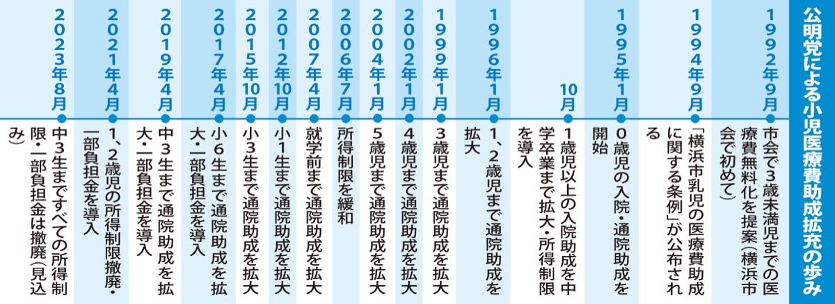 その歴史は、1992年の横浜市会において公明党市議団が「3歳未満児の医科医療費無料化を横浜市においても実施すべきである」と主張したことから始まります。当初は厳しい反応もありましたが、94年には条例が提案され、翌95年1月から0歳児を対象に制度の導入が実現しました。