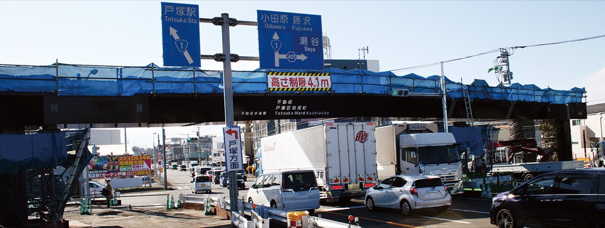 県道瀬谷柏尾線の起終点と国道1号線が交わる同交差点。工事中の歩道橋は完成すると幅3m、長さは約40mの規模になる予定。そのほかスロープ、エレベーター2基が設置され、完成すれば利便性が向上する。