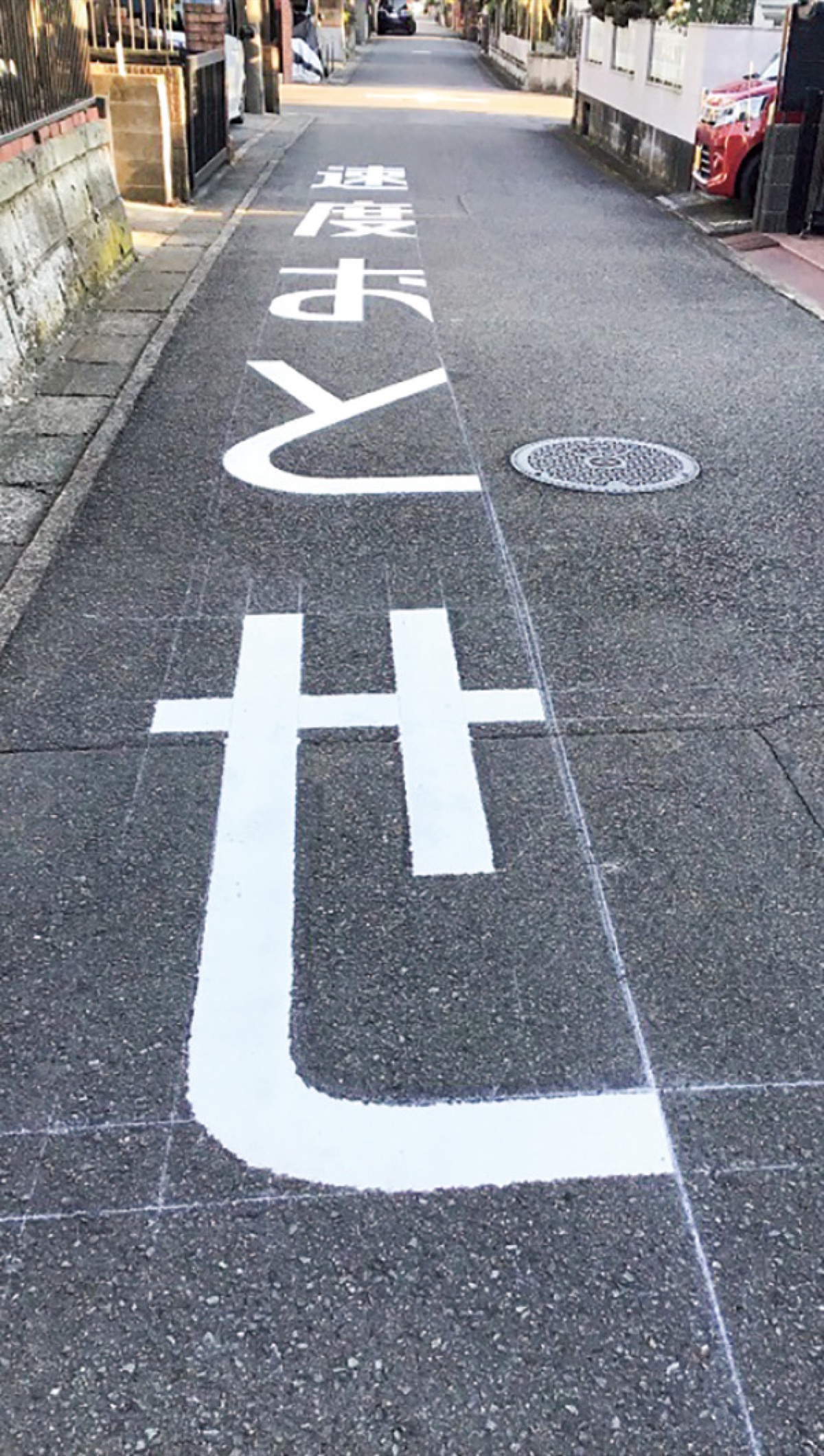 速度超過の通り抜け車両が多く危険とのご相談を頂き、下瀬谷3丁目30〜44付近の交差点の3カ所において【1】「速度落とせ」表示2カ所新設、【2】交差点マーク2カ所再整備を実施しました。