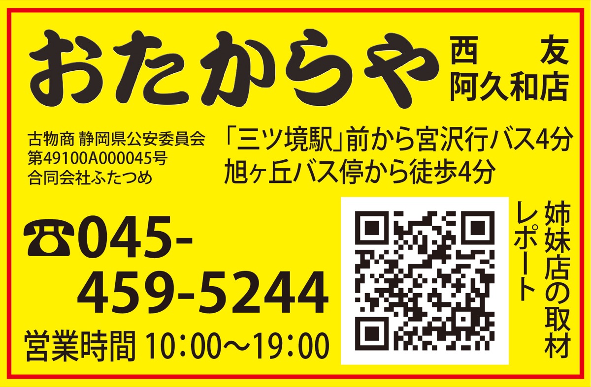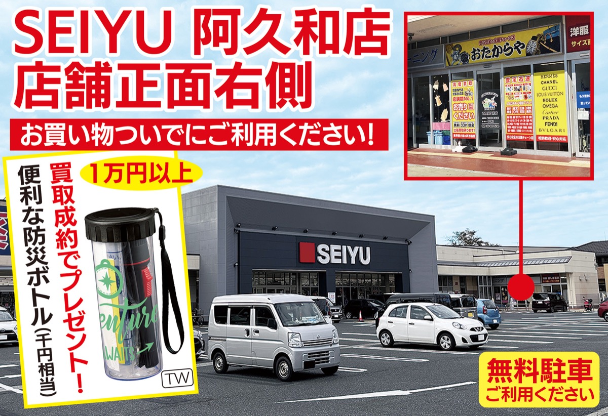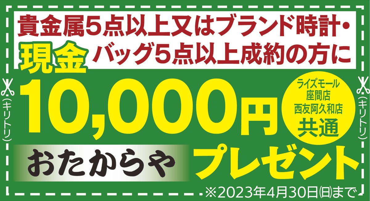 西友阿久和店横の買取専門店「おたからや」では、事前に下記クーポンを提示して同店指定の品物5点以上を成約すると現金1万円を進呈中。