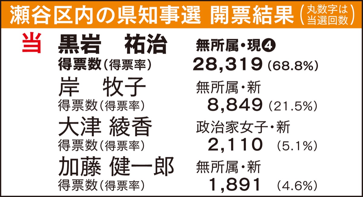 無効票が約21万票あり、前回の約2・4倍。投票総数に対して6・91%で、黒岩氏が初当選した2011年以降では最も高い割合だった。投票率は40・35%で過去最低だった前回を0・07ポイント上回った。