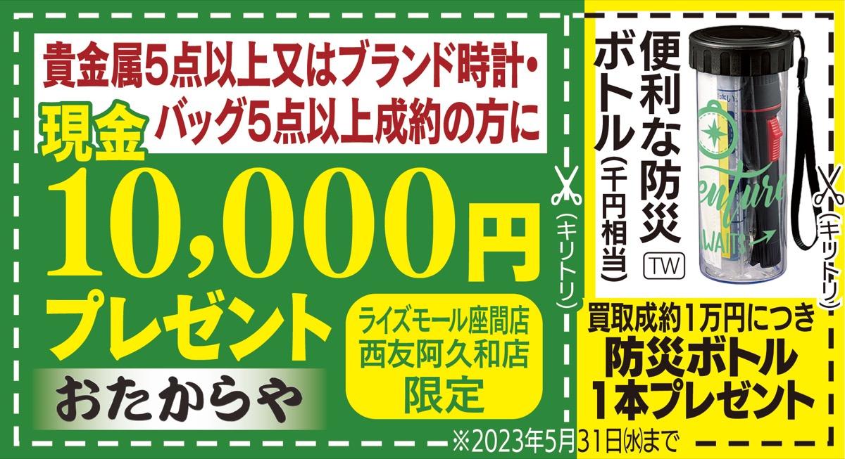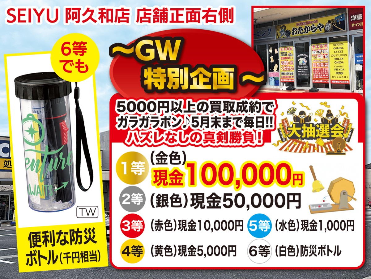 買取専門店「おたからや」西友阿久和店が今日4日から、5千円以上の買取で最高10万円が当たるガラポン抽選会を開催する。5月末までの開催中は6等でも千円相当の「防災ボトル」を進呈する(数量限定)。