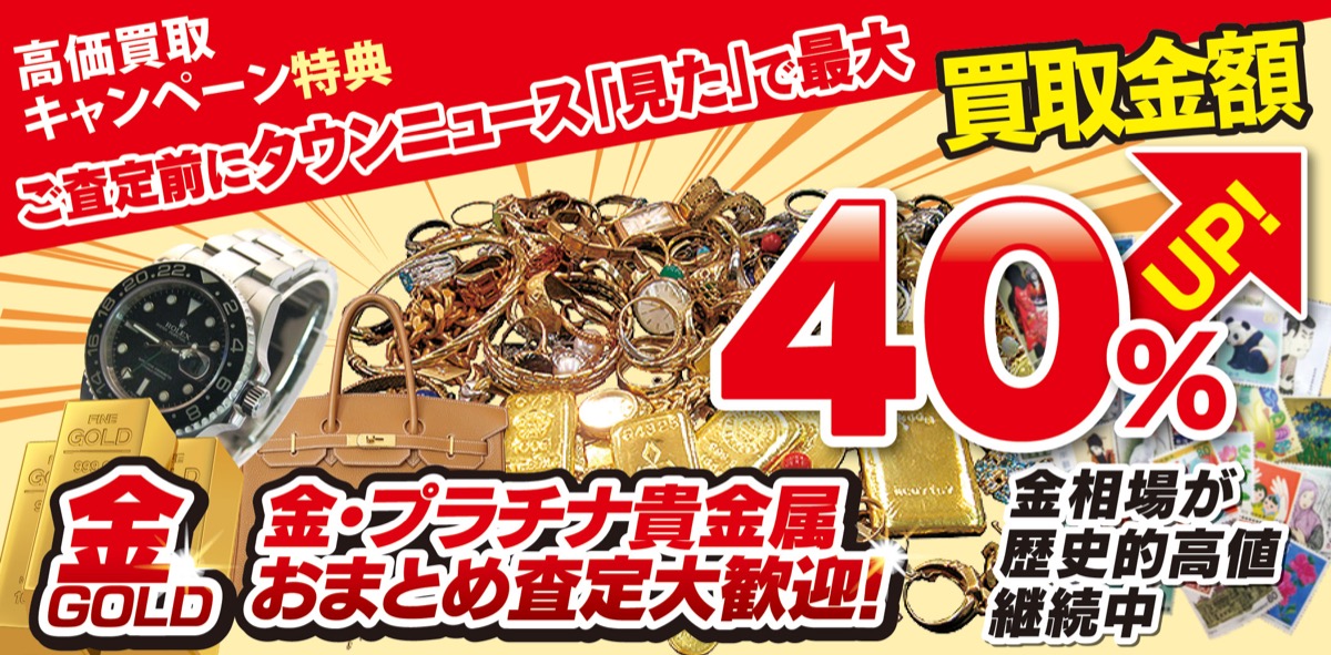 同店では高級腕時計、貴金属、バッグ、各種ブランド品など、同店指定の品物5点以上成約時に下記クーポンを提示すると、成約額とは別に現金1万円も進呈中。