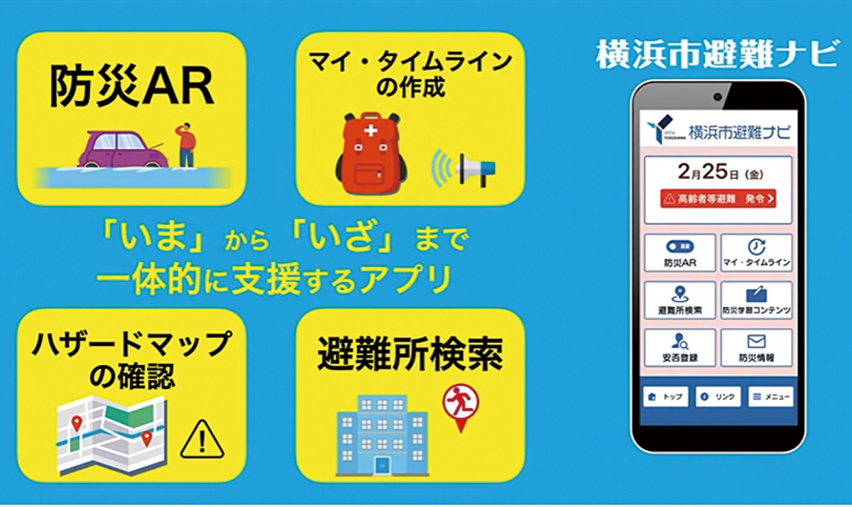 R5年度から本格運用の「横浜市避難ナビ」は、一人一人の避難行動を平時の「いま」から災害時の「いざ」までサポートするアプリです。