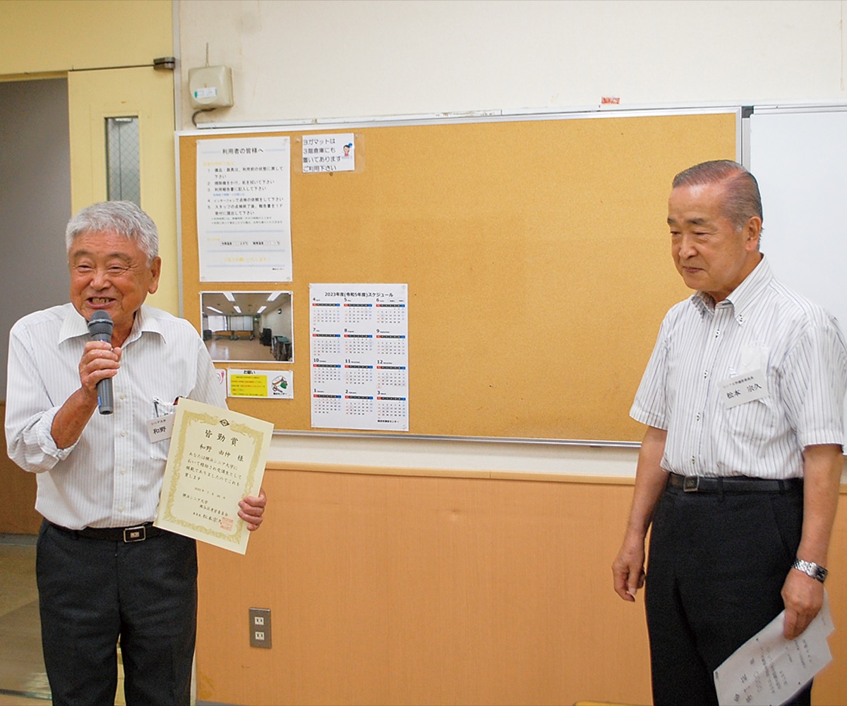 最終日には全ての授業に出席した優秀出席者に皆勤賞が送られ、代表として和野由仲さんに賞状が授与された。和野さんは「人生に役立つ知識を得ることが出来た」と話した。瀬谷区の同大学運営委員長の松本宗久さんは「今後も地域のシニアに有益な情報を提供していきたい」と語った。