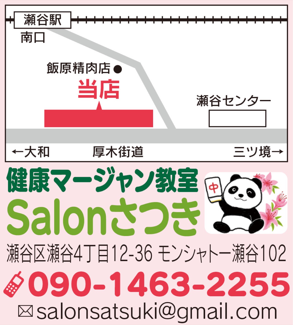 厚木街道沿いのモンシャトー瀬谷でオープンした『健康マージャン教室Salonさつき』は、賭けない、飲まない、吸わないがモットーの健康的な麻雀教室。