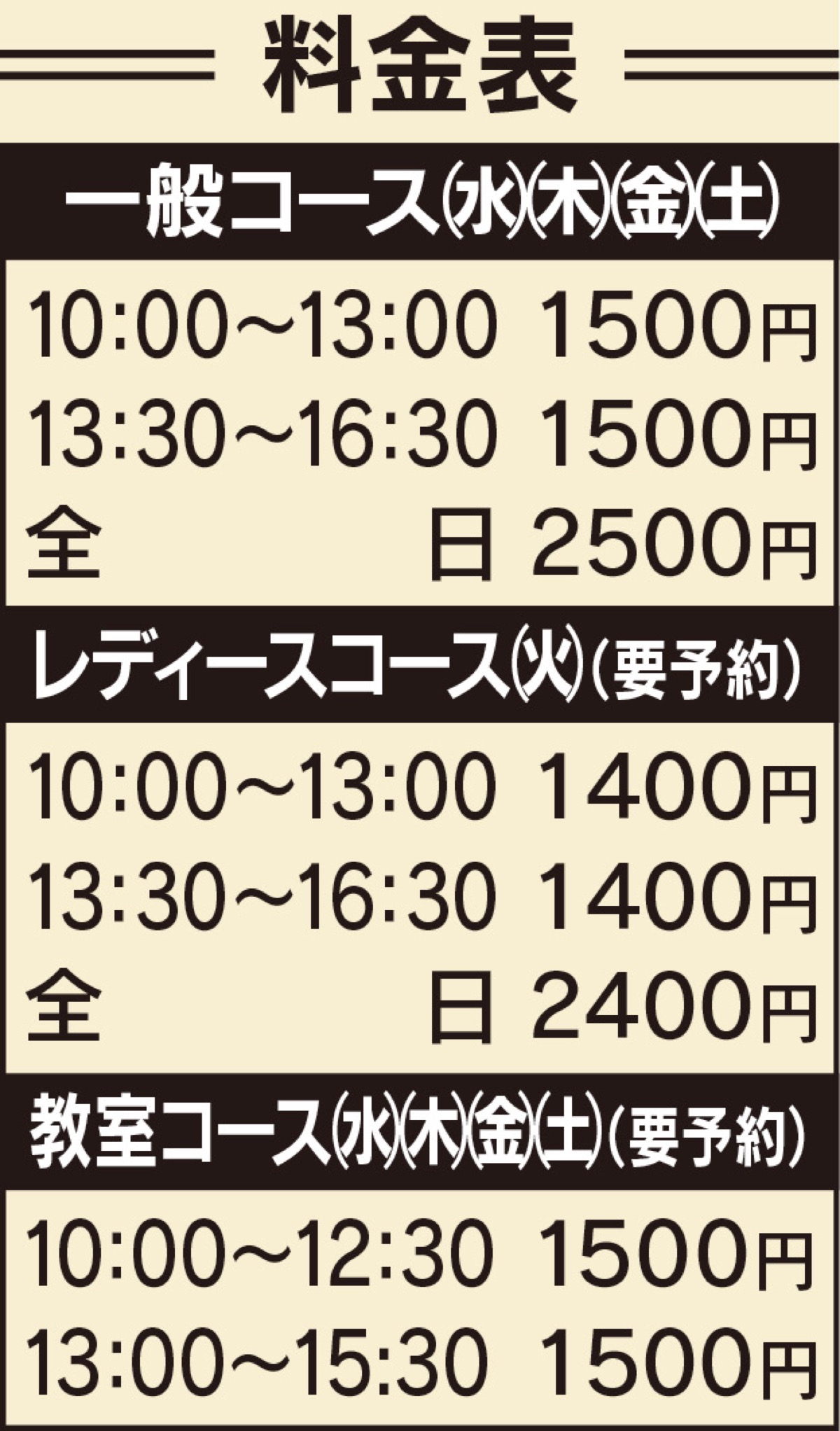 教室では経験者向けの「一般コース」、いつでも質問できる「レディースコース」、基礎から応用まで学べる「教室コース」を用意。ルールが分からなくても親切・丁寧に指導するので、初心者にもオススメだ。