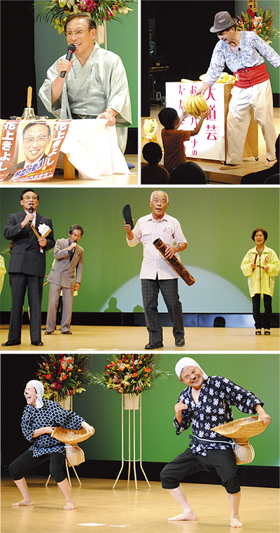 当日の舞台は三部構成。第1部は家族演芸大会と題し、花上議員自らが司会を務めた「笑点と素人大喜利」「少林寺拳法演武」や、勝守グループによる大爆笑の「どじょうすくい」に「バナナのたたき売り」、「南京たますだれ」「銭太鼓」のほか、歌や踊り、瀬谷の竹を使った竹琴太鼓の演奏など、様々な舞台が繰り広げられた。第二部では田中慶秋衆議院議員やツルネン・マルテイ参議院議員らを招いての記念式典が、第三部では湯原昌幸さんや地元出身の歌手による歌謡ショーが披露された。最後には福引大抽選会も行われ、イベントは大いに賑った。
