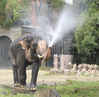 飼育担当者がホースから水を出すと、オスのラスクマルは鼻に水をため、号令に合わせて勢いよく水を噴き出すパフォーマンスを披露=写真。メスのチャメリー、シュリーもプールに入ったり、スプリンクラーの水を浴びるなど、気持ち良さそうな顔を見せていた。