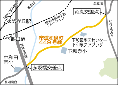 同市道周辺には下和泉小学校や地区センター、地域ケアプラザなどがあるが、歩道が整備されているのは地区センター付近の一部。同校スクールゾーンへのカラーベルト設置といった交通安全対策が進むものの、同市道の歩行は児童にとって危険と、同校は同市道を通学路に指定していない。