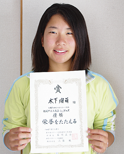 第51回神奈川県スポーツ祭典(新日本スポーツ連盟主催)の硬式テニスシングルス大会が県立体育センターで5月19日に行われ、新橋町の木下瑠萌さん(岡津中3年)が女子シングルスで優勝し、全国大会出場を決めた。