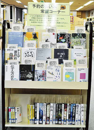 予約が多く、本棚に並ばない本を館内で読んでもらおうと、同館が昨年10月に設置したもので、今回は棚を大きくして本を増やしたほか、表紙が見えるように置くなど、手に取りやすくなるよう工夫した。